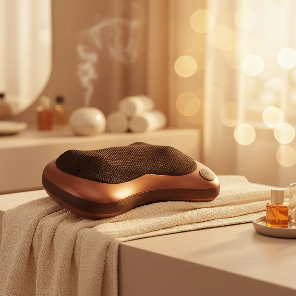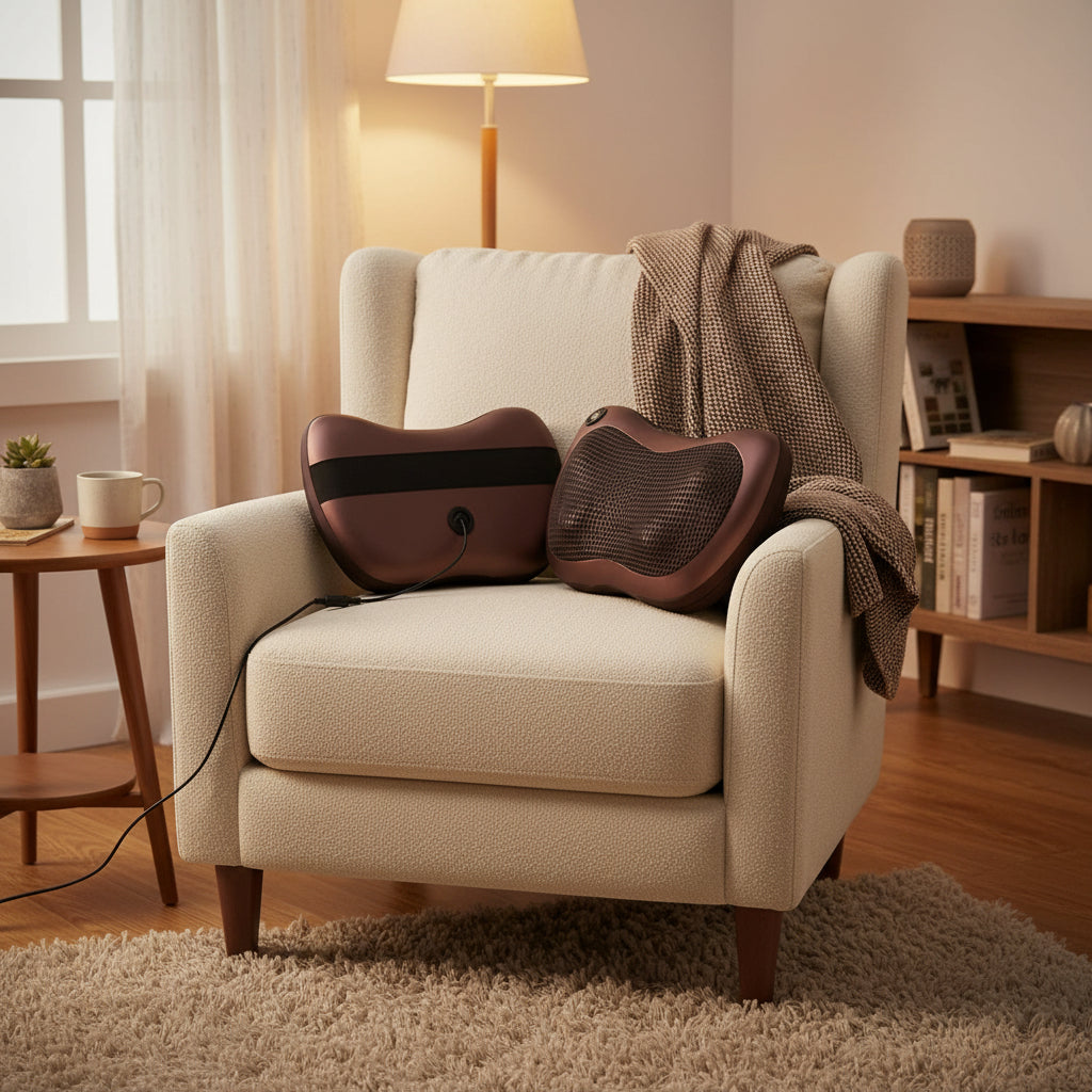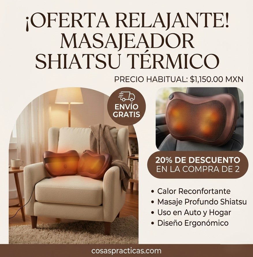La almohada inteligente que transforma tu asiento del coche o el sofá de tu sala en una sesión de masajes Shiatsu profesional. Alivio instantáneo donde más lo necesitas.